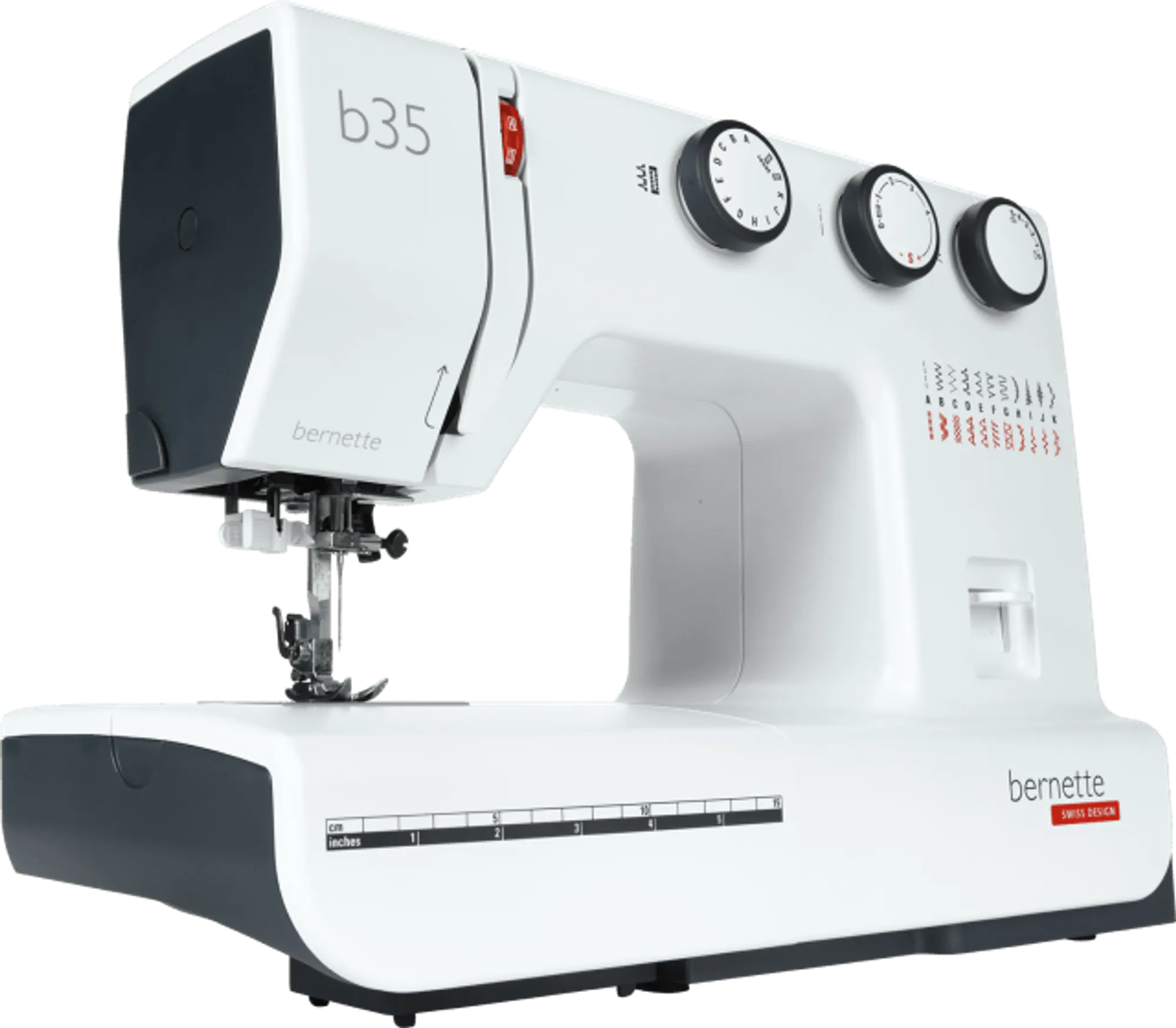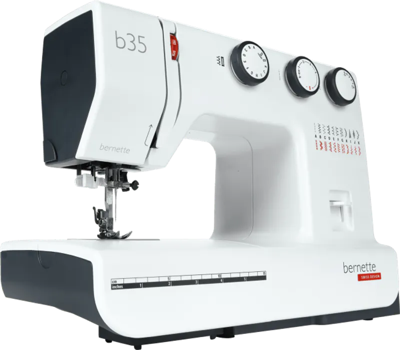 The bernette 35 is a mechanical sewing machine with no computerized controls. The width, length and pattern of the stitch is easily set by turning the three knobs. The tension can be adjusted during sewing, using an easily accessible wheel. The bernette 35 also has an automatic, 1-step buttonhole function, which is quick and easy to use. With a total of 23 stitches, including both utility and decorative stitches, you can bring your creative ideas to fruition quickly, easily and with excellent stitch quality. The bernette 35 includes seven snap-on presser feet.