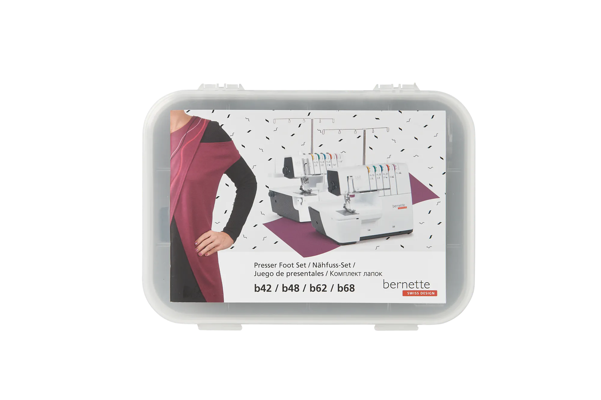 This set for the bernette cover and combo machines contains 7 practical presser feet for decorative coverstitch seams.