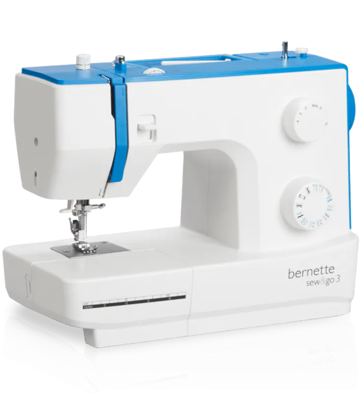 The bernette sew & go 3 is the mid-range model of the three mechanical models. The stitch package features 19 stitches, including a buttonhole with a maximum stitch width of 5 mm. The two knobs on the front of the machine and the wheel on top can be used to set thread tension or stitch length, as well as to select stitches. The manual needle threader and the thread cutter help you sew quickly and with consummate ease. Four presser feet (soles) come as standard with the bernette sew&go 3.
