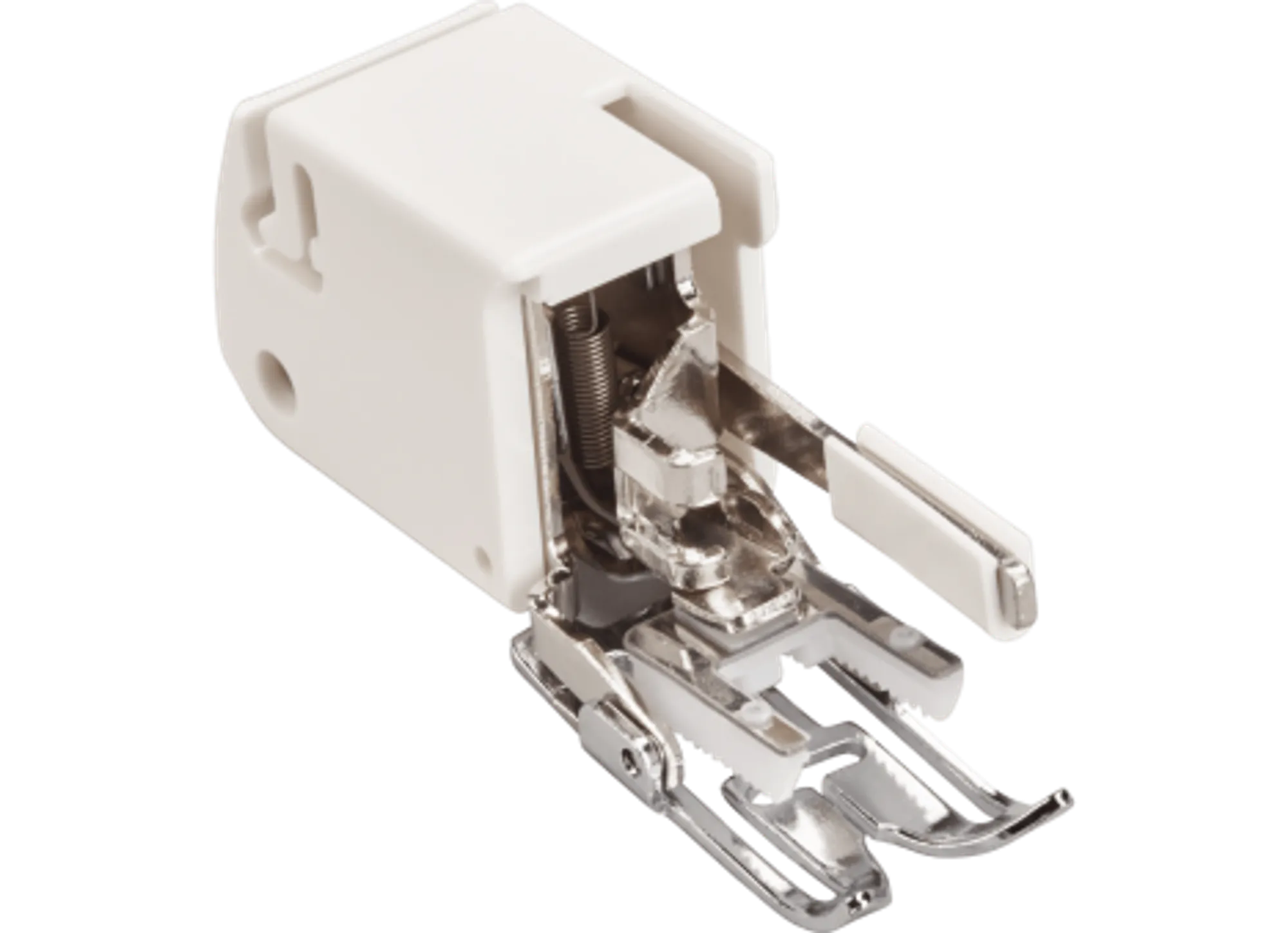 Difficult-to-work-with fabrics are best sewn using the Walking Foot. It supports the fabric feed by a second feed dog on the upper side of the foot. The sewing project is moved simultaneously by the two feed dogs which allow a smooth sewing process.