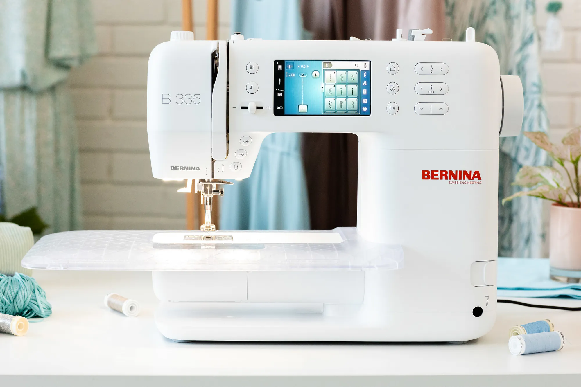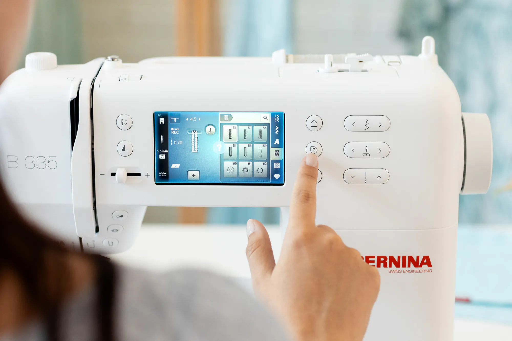 A standout feature of the 335 is the Bernina Free Hand System, which lets you raise or lower the presser foot with a knee lever so both hands stay on your fabric while sewing or repositioning