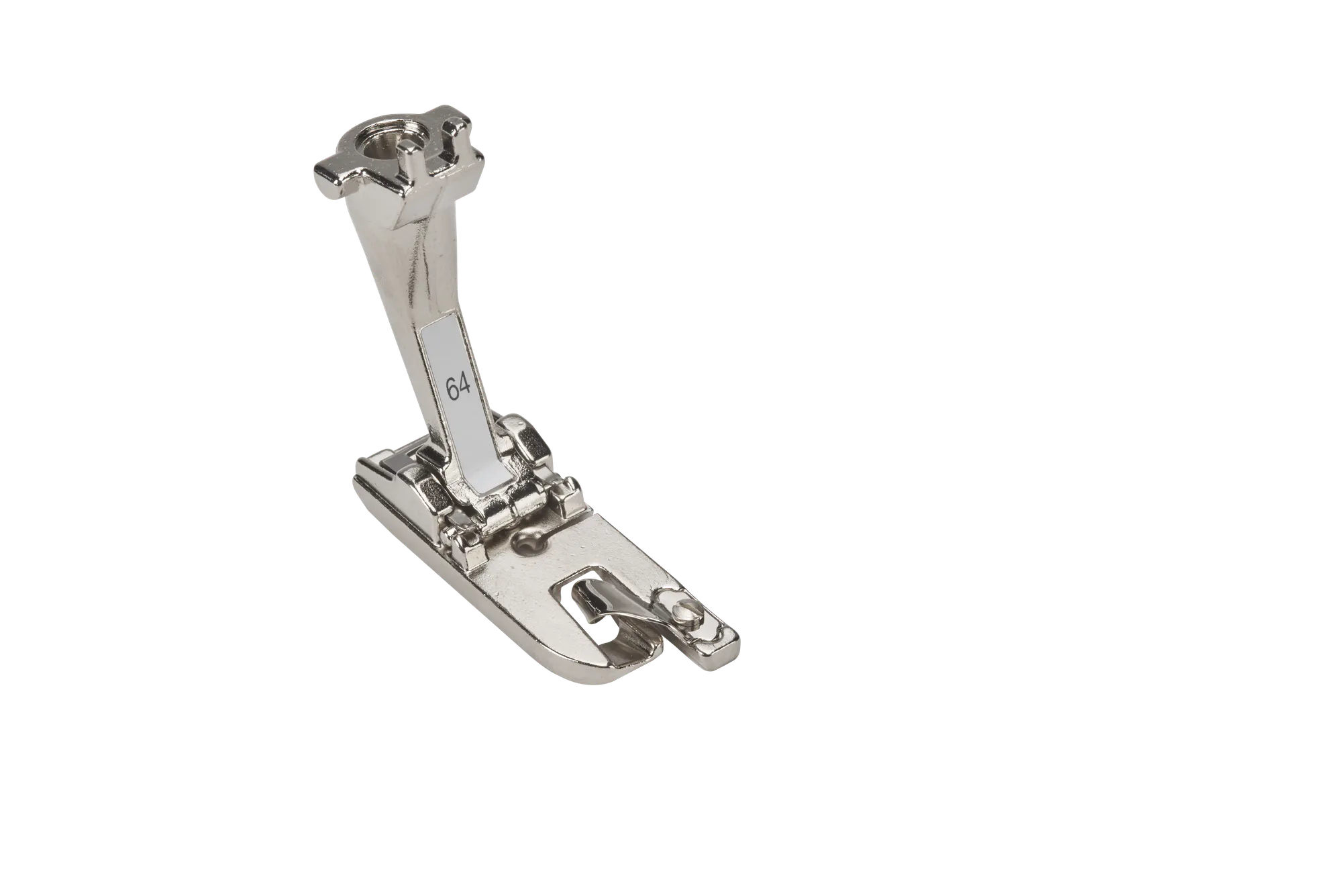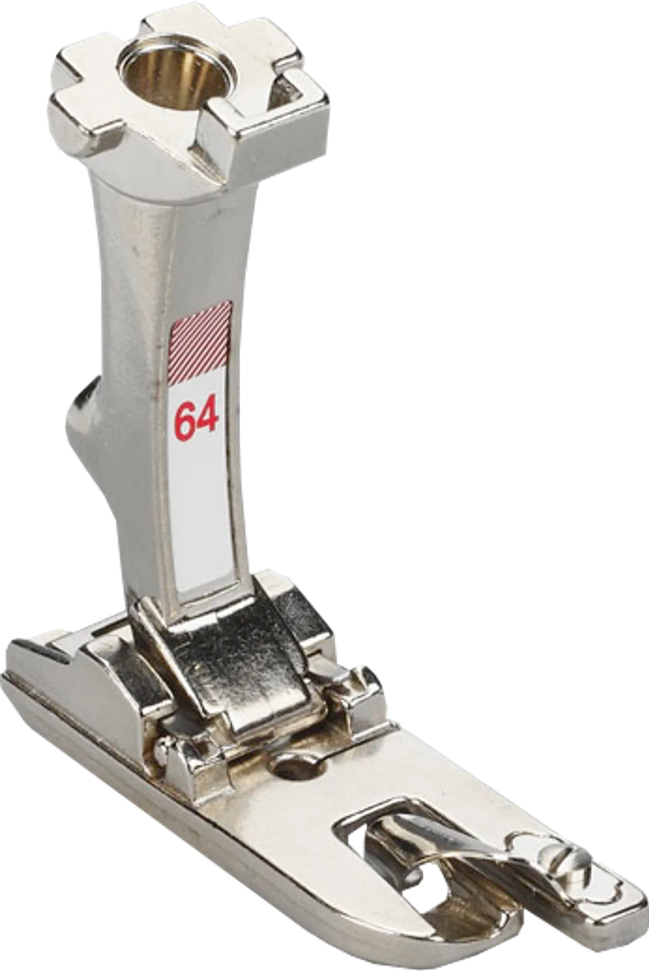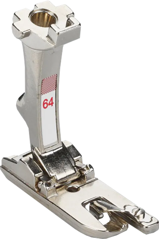 Used in combination with the straight-stitch plate, the Straightstitch hemmer creates a hem with particularly beautiful stitching. The fabric is folded over twice in a single operation as it is sewn with a straight-stitch. Foot #64 is used for hems with a width of 4mm.