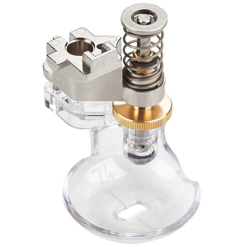 Quilting around raised or dimensional elements of your quilt is easier than ever with the help of the Adjustable Gliding Cup Foot #74. Smoothly glide over lifted or uneven edges of embellishments and appliqués. The transparent cup allows for clear sight lines to the needle and fabric giving you more control over the creative process.