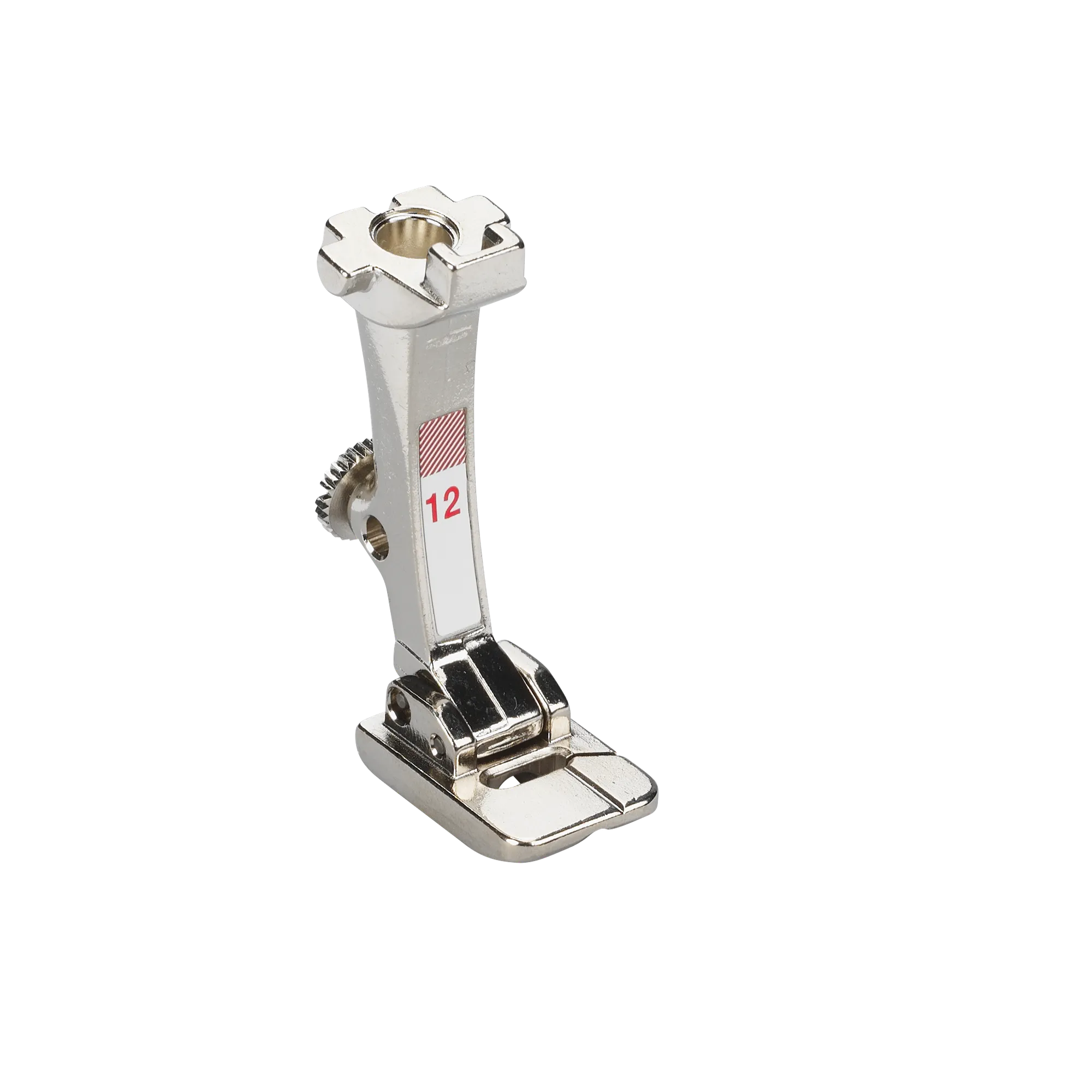 For seaming knits and couching thick cords, strings of beads and sequins, and for making and sewing in piping in a single operation. One side of the sole is longer than the other, allowing even thick and uneven fabrics to travel under it smoothly.