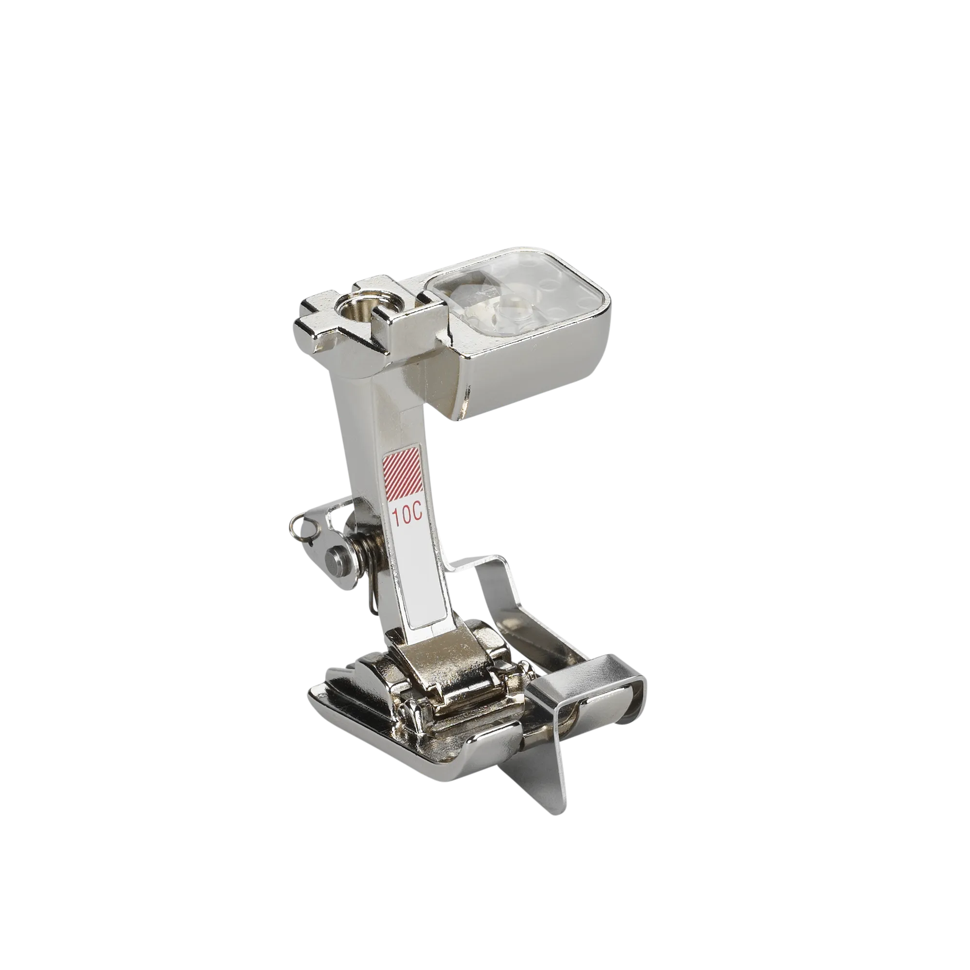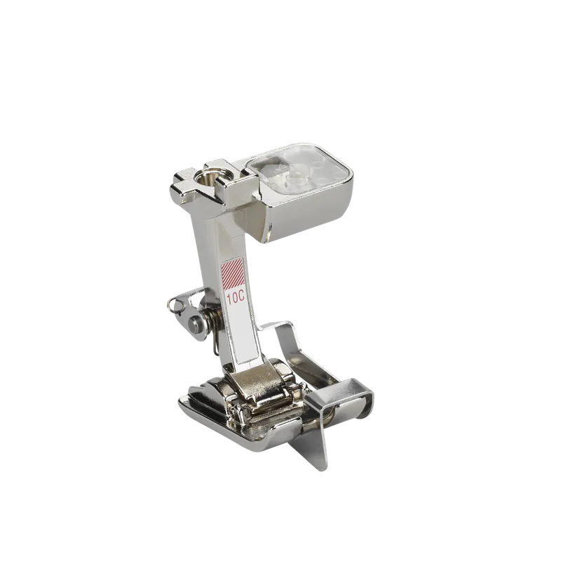 This presser foot with guide is excellent for topstitching edges, hems and pleats. It is also ideal for sewing on lace or ribbon and for reinforcing edges. The guide lets you sew perfect seams and hems running parallel to the edge.