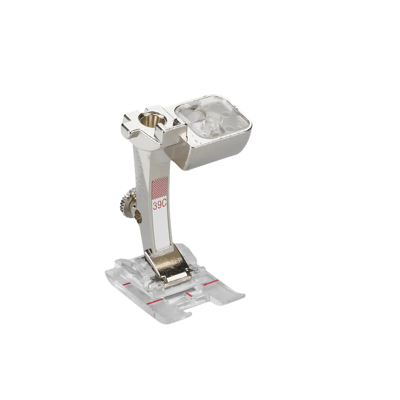 This foot is especially suitable for decorative stitches, buttonhole seams, appliqués, couching perle yarn, and sewing offthe-edge scallops. It can also be used to create raised effects. The small hole in the centre of the foot acts as a guide for couching a narrow cord. The clear sole provides a good view of the embroidery area.