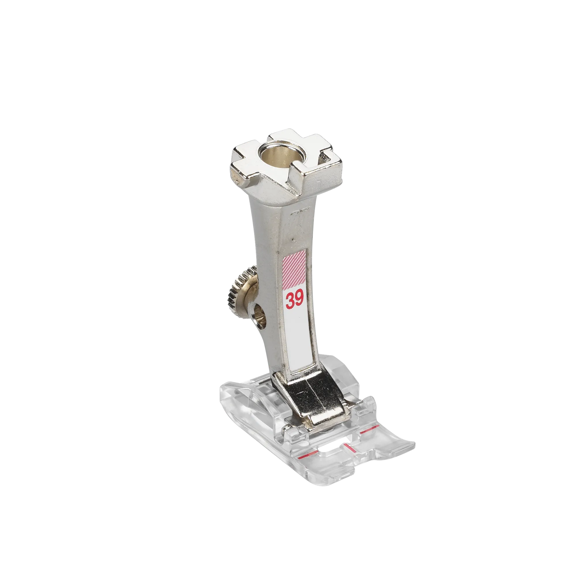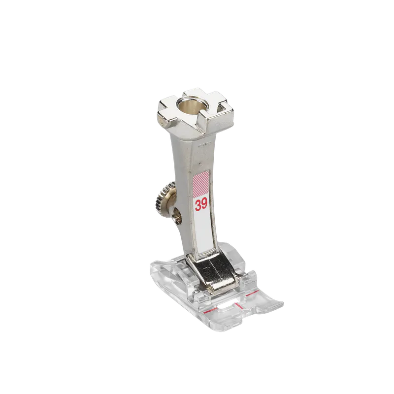 This foot is especially suitable for decorative stitches, buttonhole seams, appliqués, couching perle yarn, and sewing offthe-edge scallops. It can also be used to create raised effects. The small hole in the centre of the foot acts as a guide for couching a narrow cord. The clear sole provides a good view of the embroidery area.