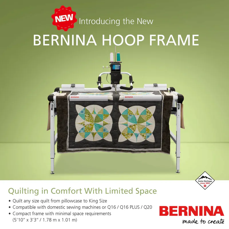 With its small footprint, the BERNINA Hoop Frame can easily fit your quilting space. It accommodates your current domestic sewing machine or a BERNINA Q 16 / Q 16 PLUS and Q20 longarm machine.