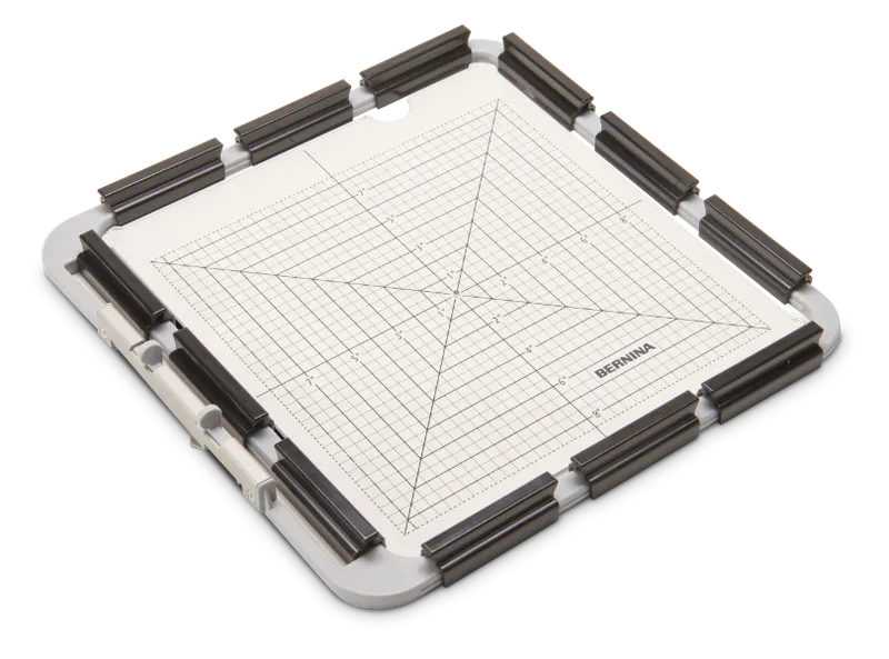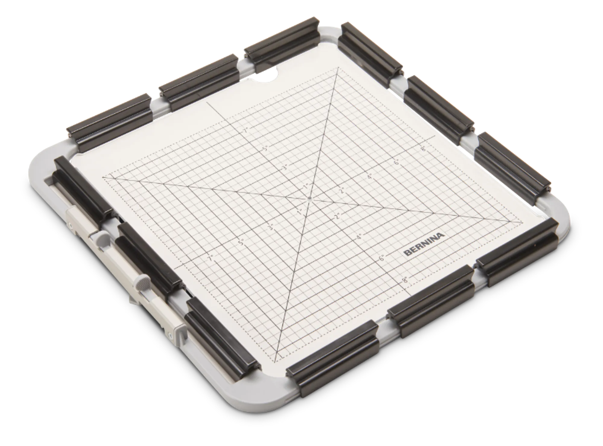 The BERNINA Medium Clamp Hoop is the ideal embroidery hoop for quilters. The square shape perfectly accommodates square designs common for quilting. This saves both embroidery stabilizer and fabric compared to oval hoops.
