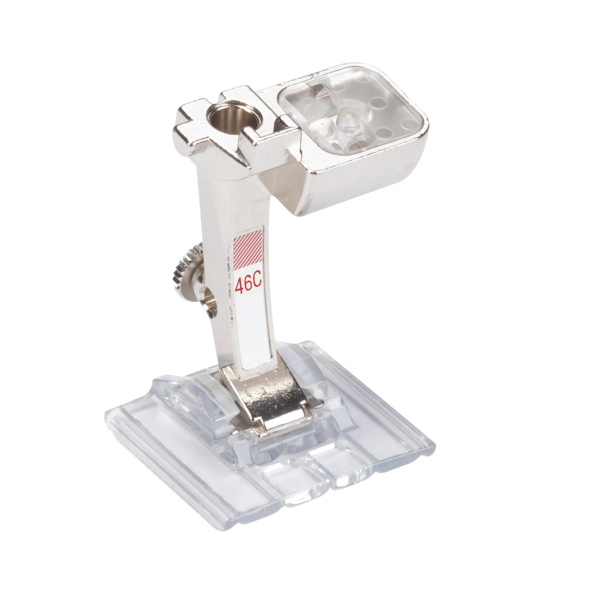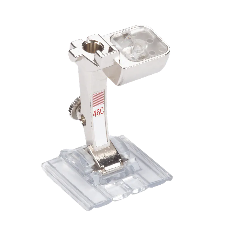This foot is specially designed to facilitate the combination of decorative stitches with pintucks. After sewing the pintucks, the same foot can be used to sew beautiful decorative stitches in between the individual pintucks or to couch ribbons. The clear sole provides a good view of the sewing area.