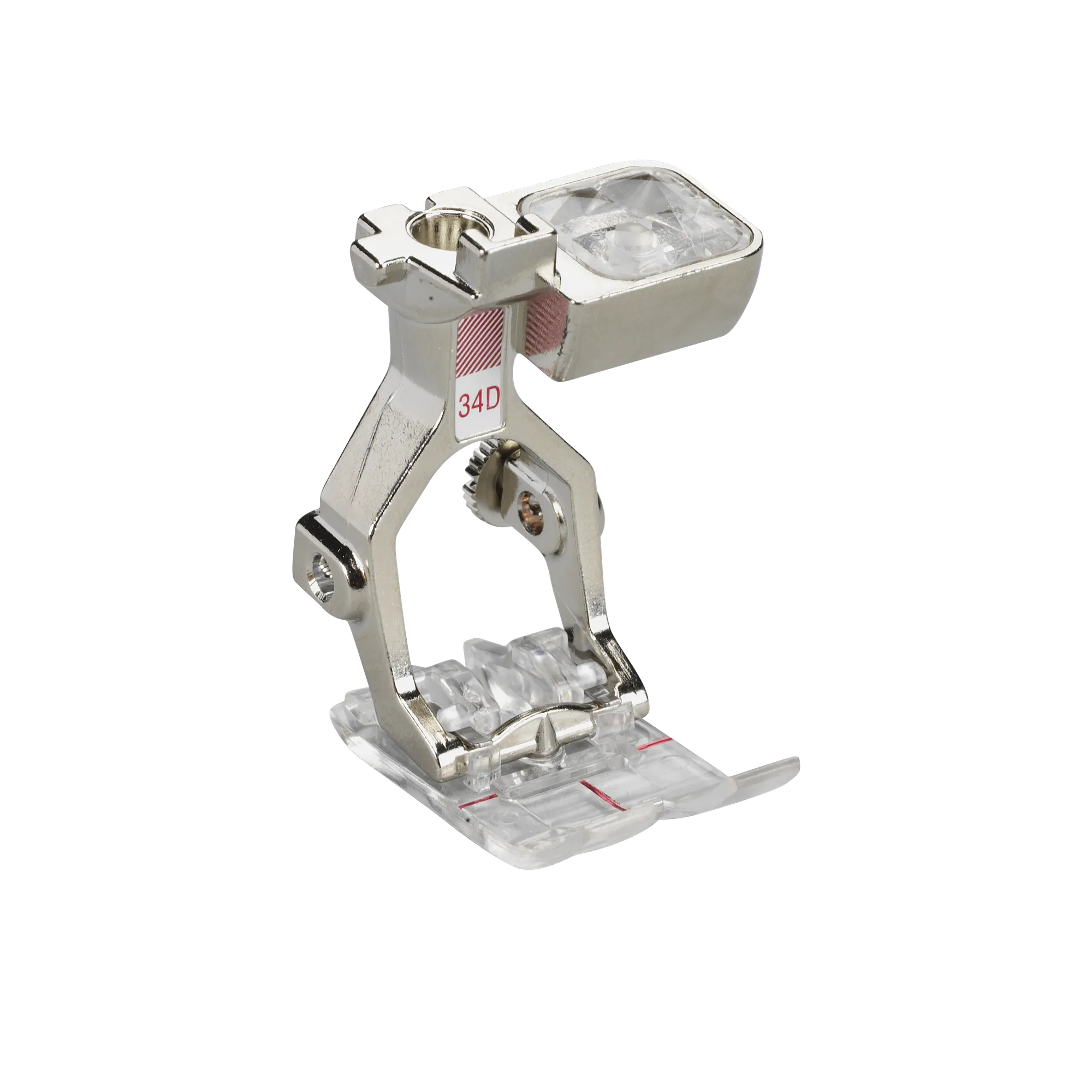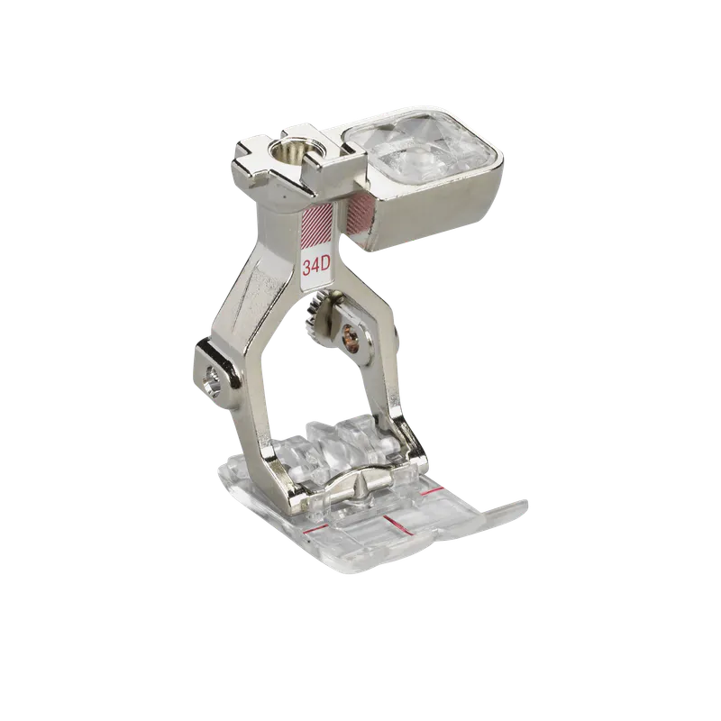 The clear sole of this Reverse-pattern foot ensures a good view of the stitching and needle area. The red markings on the top of the foot allow especially accurate and careful sewing.