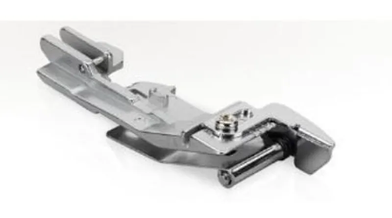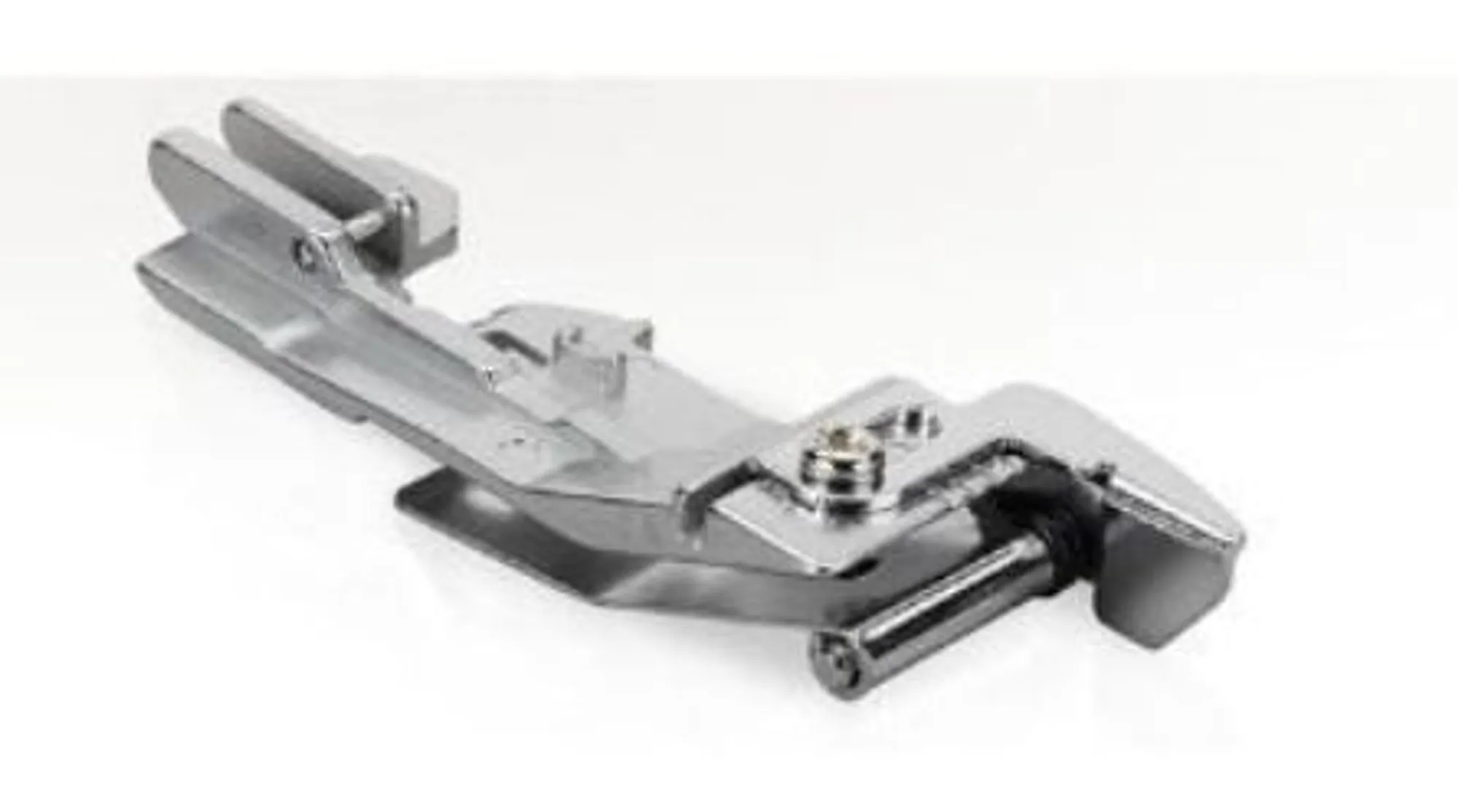 The fabric to be gathered is positioned underneath the Gathering Attachment, whilst the fabric that remains flat is added on top. The fabric is gathered with differential feed while it is sewn and neatened together with the flat fabric.