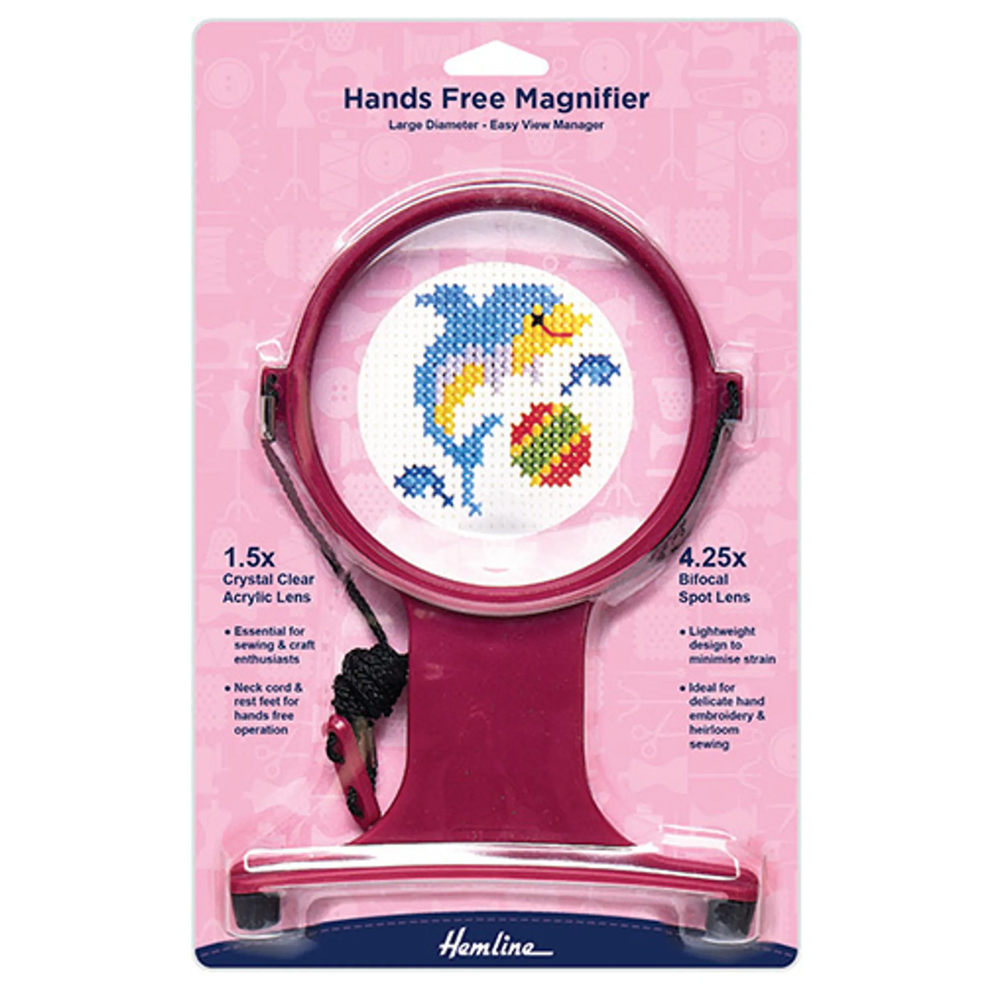 Magnifying glass that hangs around your neck resting against your chest to leave your hands free.
