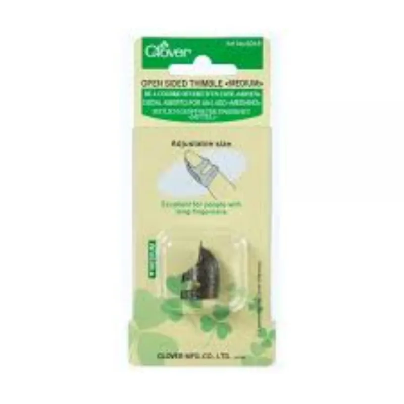 Adjustable Open Sided Thimble that fits your finger comfortably. Designed with an open top to keep your finger from perspiring. Dimpled for easy use on needles. Suited for people with long fingernails.