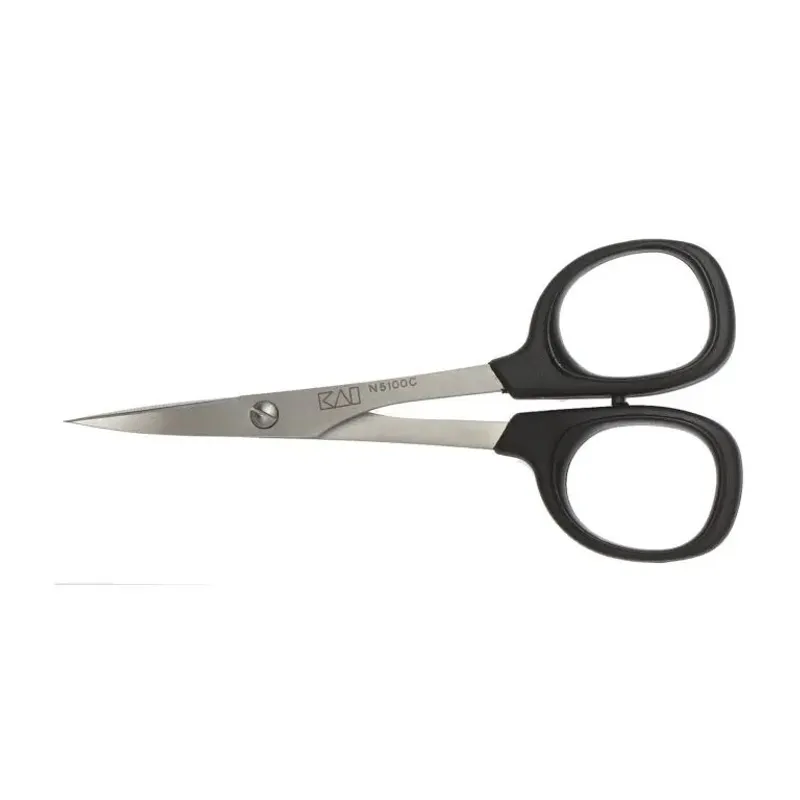 The Kai 5100c scissors have sharp, pointed and curved tips for clipping jump stitches in embroidery designs, lettering and machine quilting.