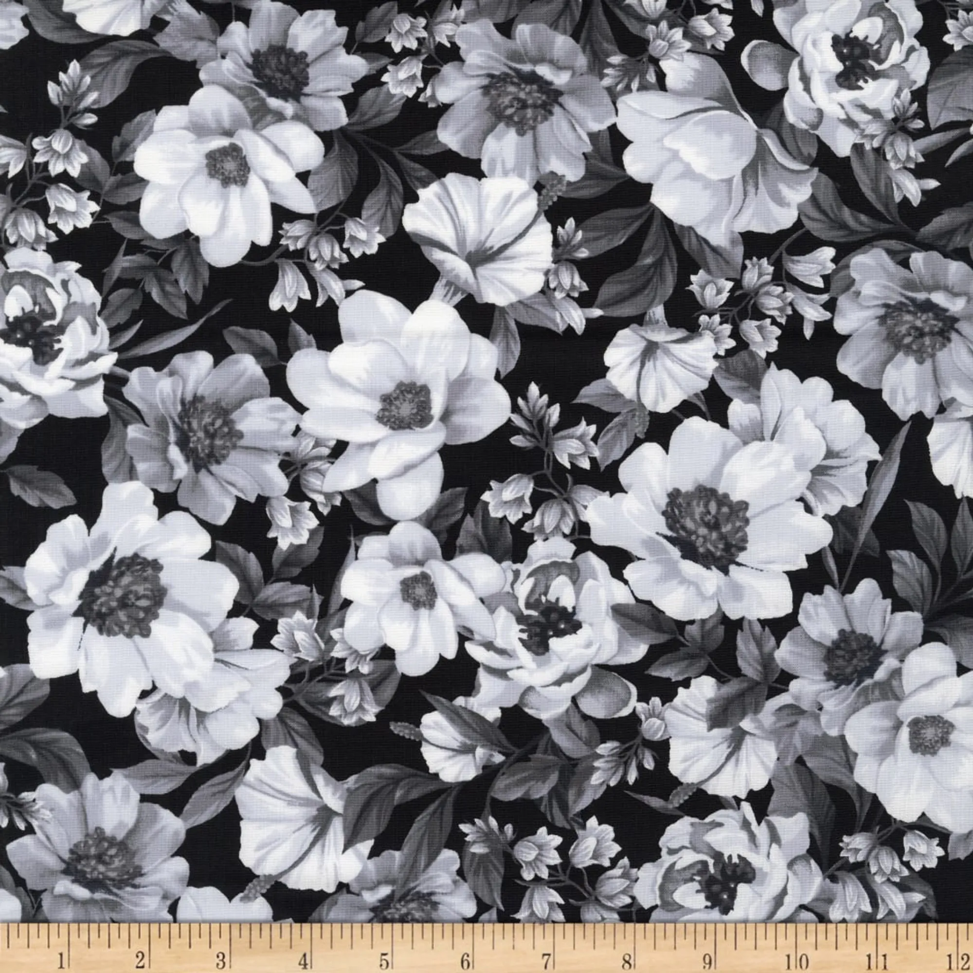 Black base fabric with large grey and white floral design