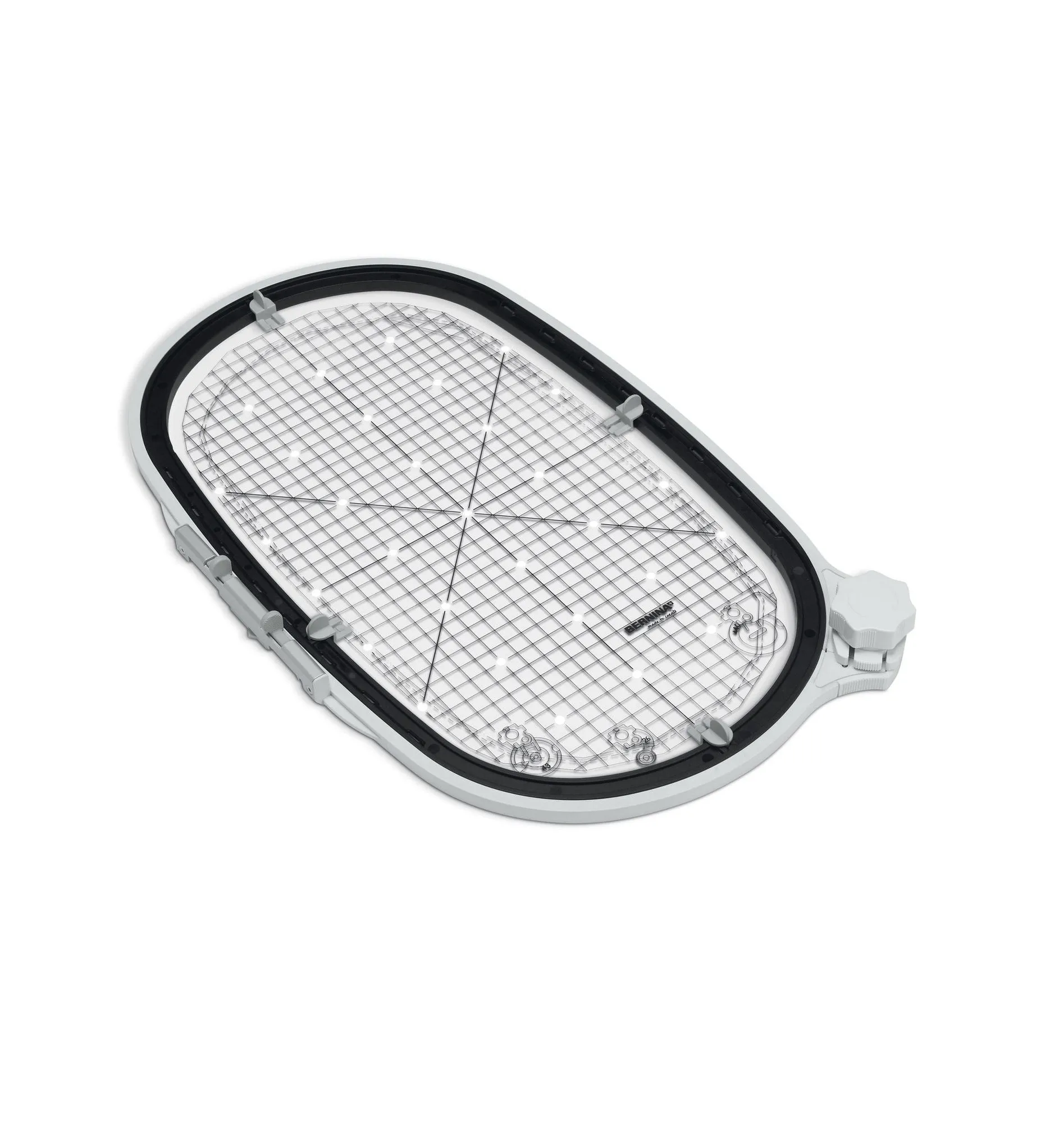 Designed for large embroidery projects, the oval Midi hoop is ideal for combining several small motifs. A large knob with a ratchet mechanism allows easy hooping and un-hooping of the material. The template serves as a support for accurately positioning the motif on the item to be embroidered