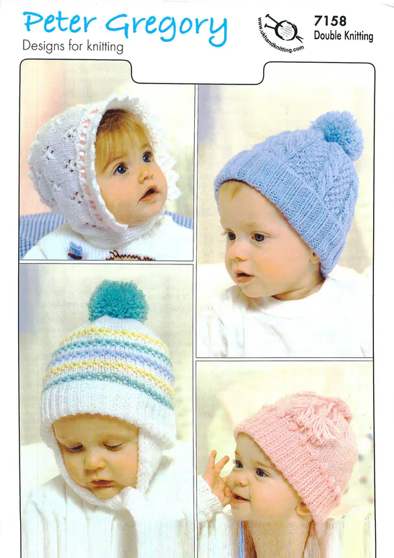 This Children's double knitting pattern 7158 by Peter Gregory will guide you in creating a range of baby hats.