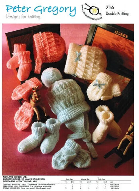 This Children's double knitting pattern 716 by Peter Gregory will guide you in creating Hat and Slippers