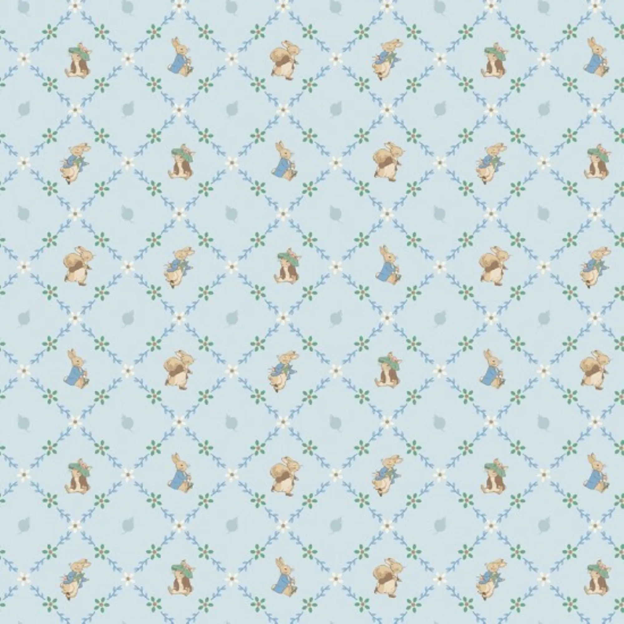 Pale Blue based fabric with Mini Peter Rabbit and Benjamin Bunny pictures within a floral diamond pattern.