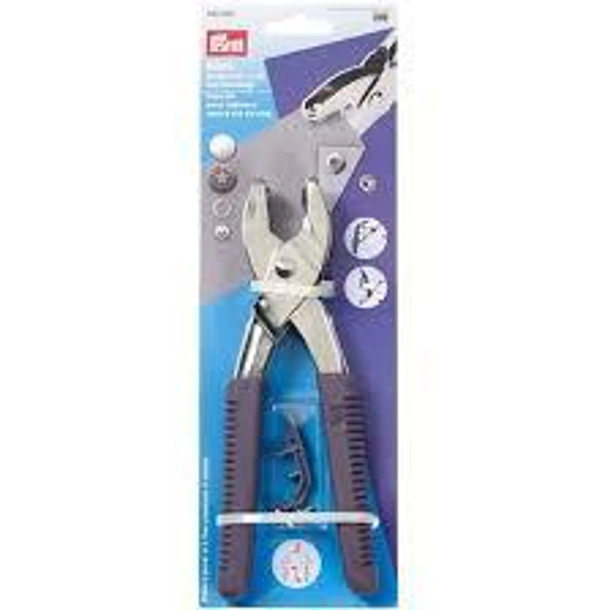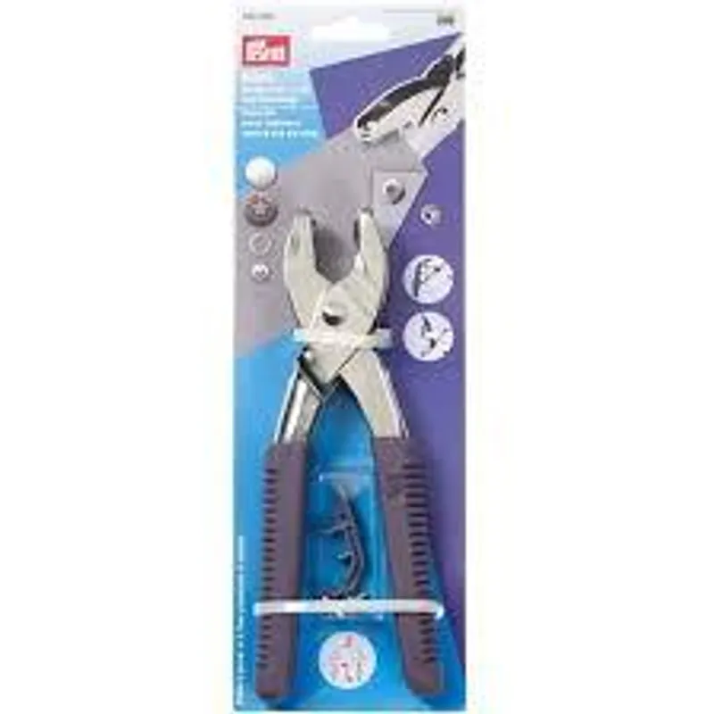 Press fastener and eyelet pliers with piercing tools for 3 and 4 mm Ø from Prym. For riveting press fasteners, eyelets and jeans buttons.
