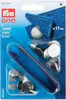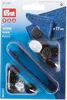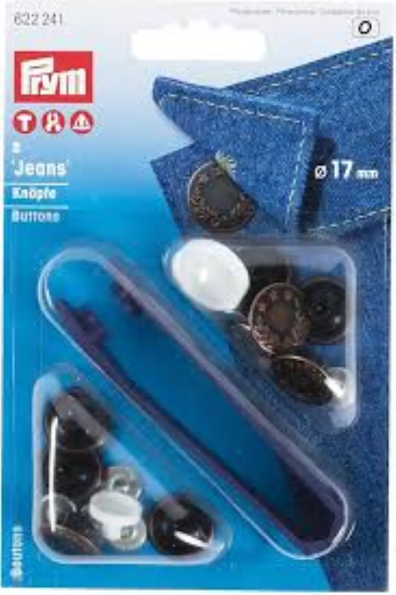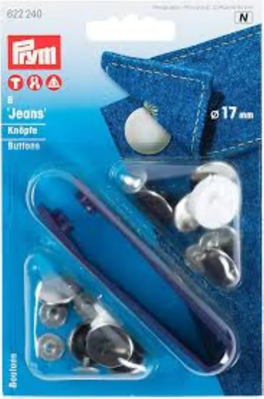 The Prym jeans buttons are designed specifically for use on denim jackets, denim shirts and jeans trousers. The non-sew buttons can be mounted either with the tool and a hammer. Since the jeans buttons are made of stainless brass, they can of course be washed at 60 degrees and dry cleaned.
