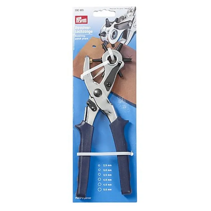 The sturdy Prym revolving punch pliers are an absolute all-rounder. They are not only suitable for punching holes in textiles or leather – they are also perfect for craft materials such as cardboard and much more. The revolving punch pliers punch 6 different hole sizes from 2.5 mm to 5 mm. The handles of the revolving punch pliers are plum blue and, because of the external grooves, each finger has a good grip. A locking latch keeps the revolving punch pliers together when not in use – this makes room for the sewing and craft tools.