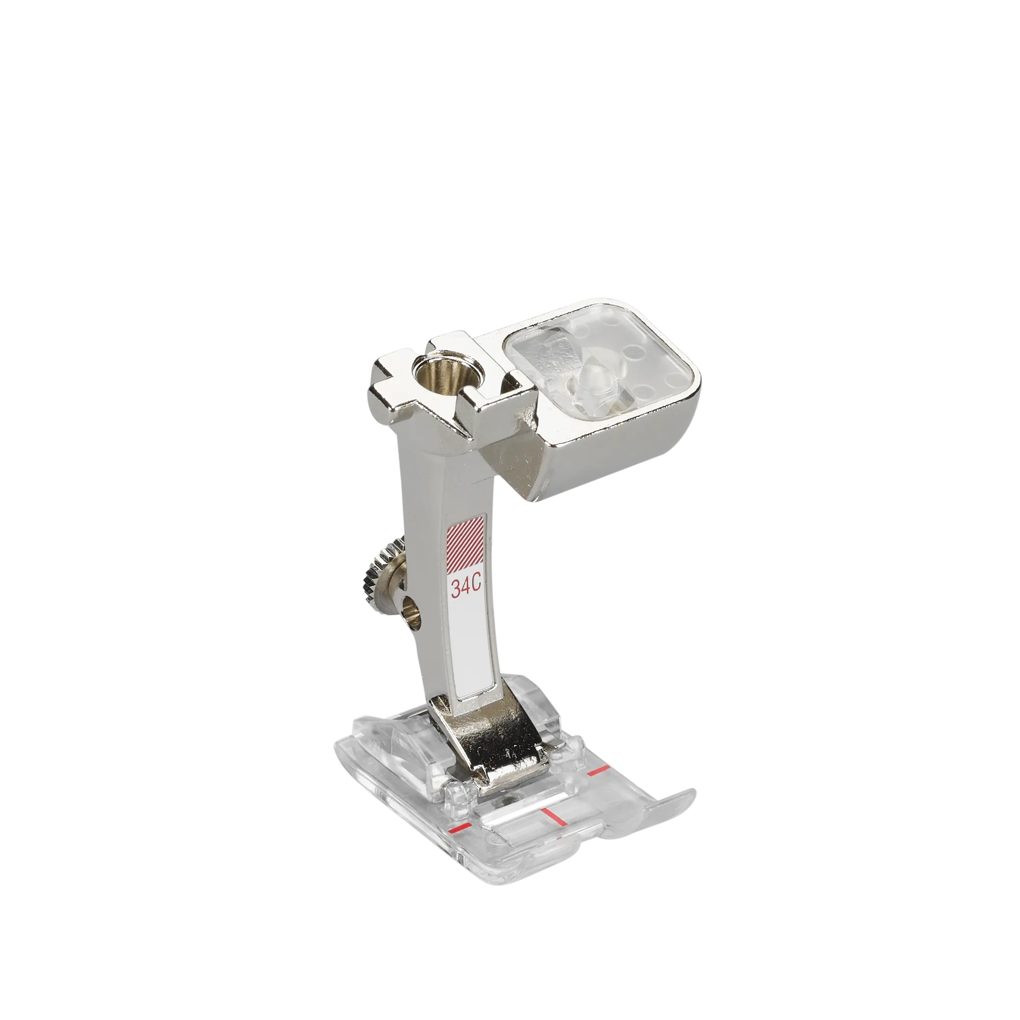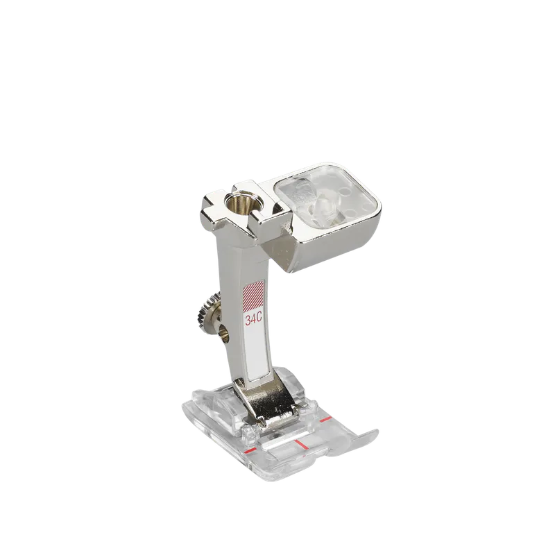The clear sole of this Reverse-pattern foot ensures a good view of the stitching and needle area. The red markings on the top of the foot allow especially accurate and careful sewing.