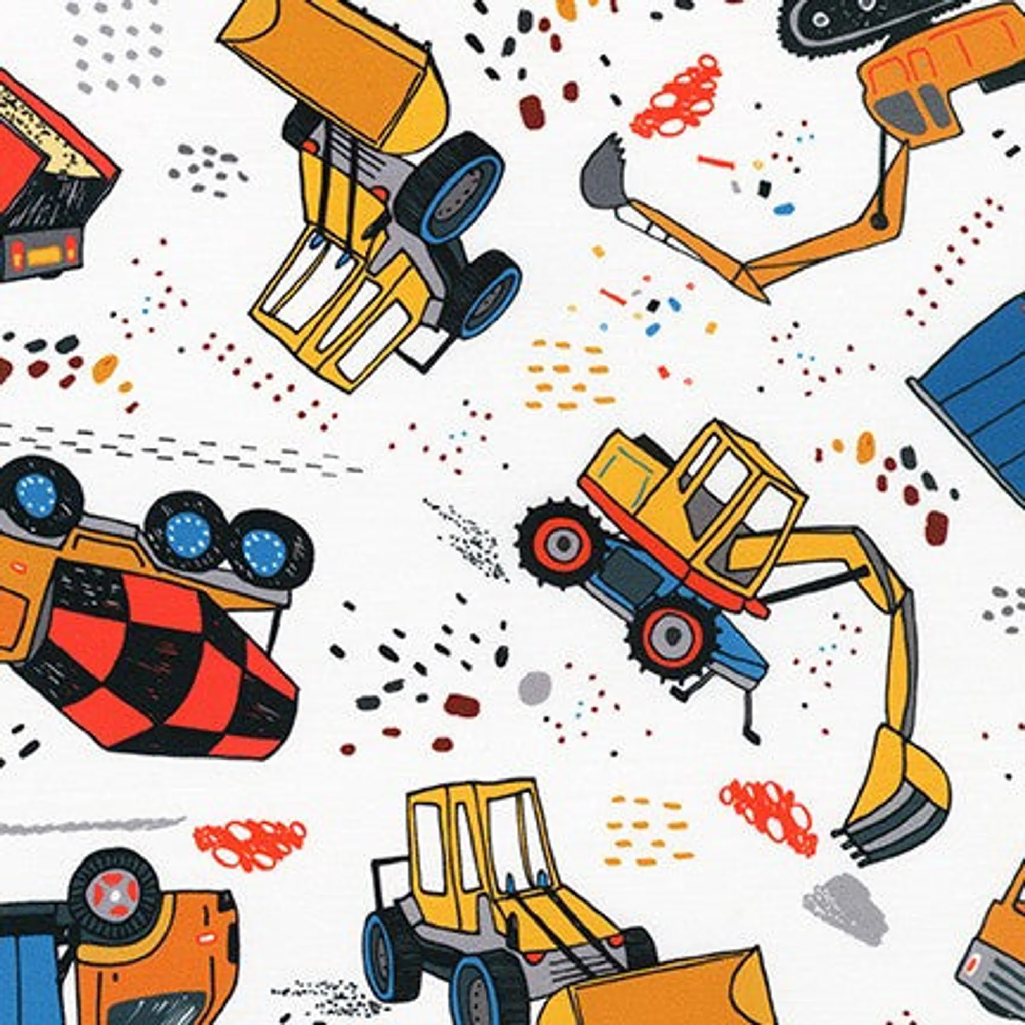 White base fabric with large Construction vehicles