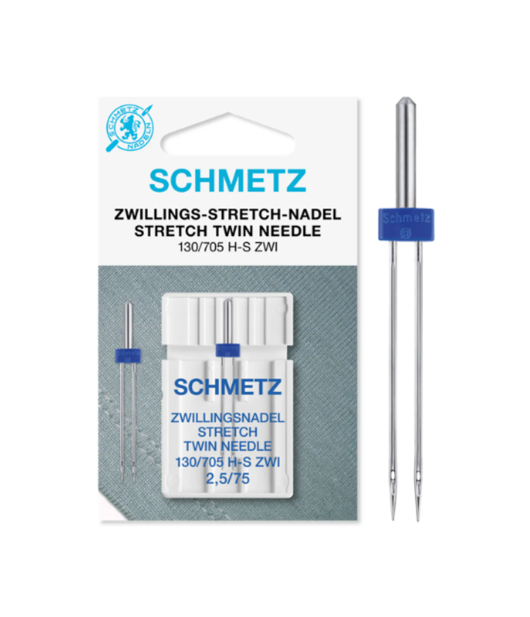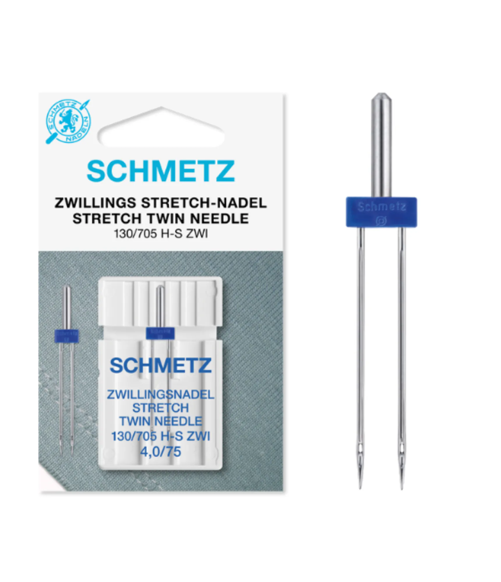 A Stretch Twin Needle (also called a Twin Needle for Stretch Fabrics) is a special type of sewing machine needle designed for creating two parallel rows of stitching on stretchy or knit fabrics - like jersey, lycra, or spandex - while maintaining the fabric's ability to stretch.