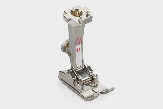 BERNINA Cordonnet Foot #11 is ideally suited for topstitching and decorative work with cordonnet thread or other thicker topstitching threads. The 2-mm-deep groove under its sole allows Cordonnet Foot #11 to glide smoothly even over thicker threads, as well as ensuring even fabric feed at all times. It also enables smooth, precise sewing of sashiko patterns and other decorative designs.