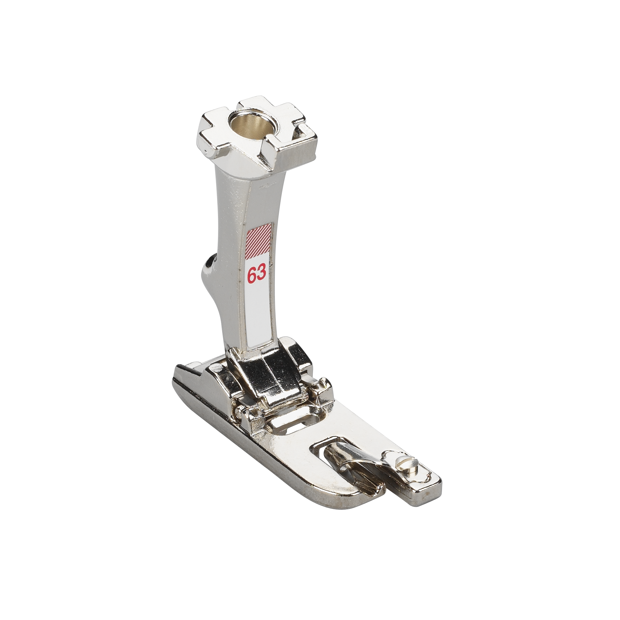 The Zigzag hemmer sews beautifully decorated non-fraying hems in a single operation. The fabric is folded over twice and sewn down with a zigzag or decorative stitch. Foot #63 is suitable for fine fabrics.