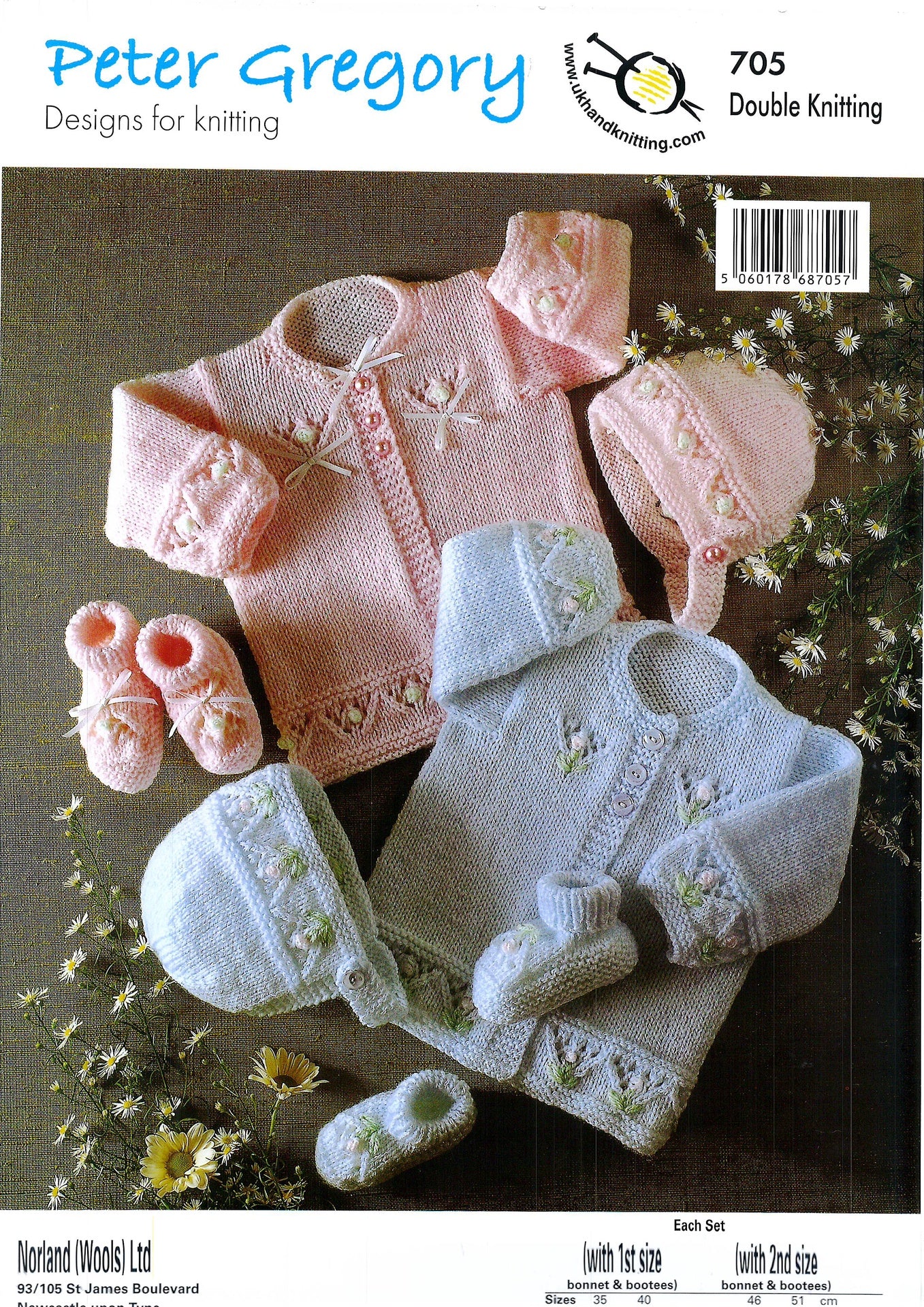 This Children's double knitting pattern 705 by Peter Gregory will guide you in creating a cardigan,hat and booties.