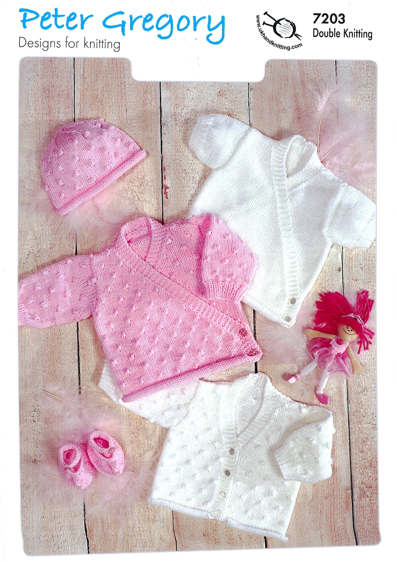 This Children's double knitting pattern 705 by Peter Gregory will guide you in creating a cardigan, hat, and booties.