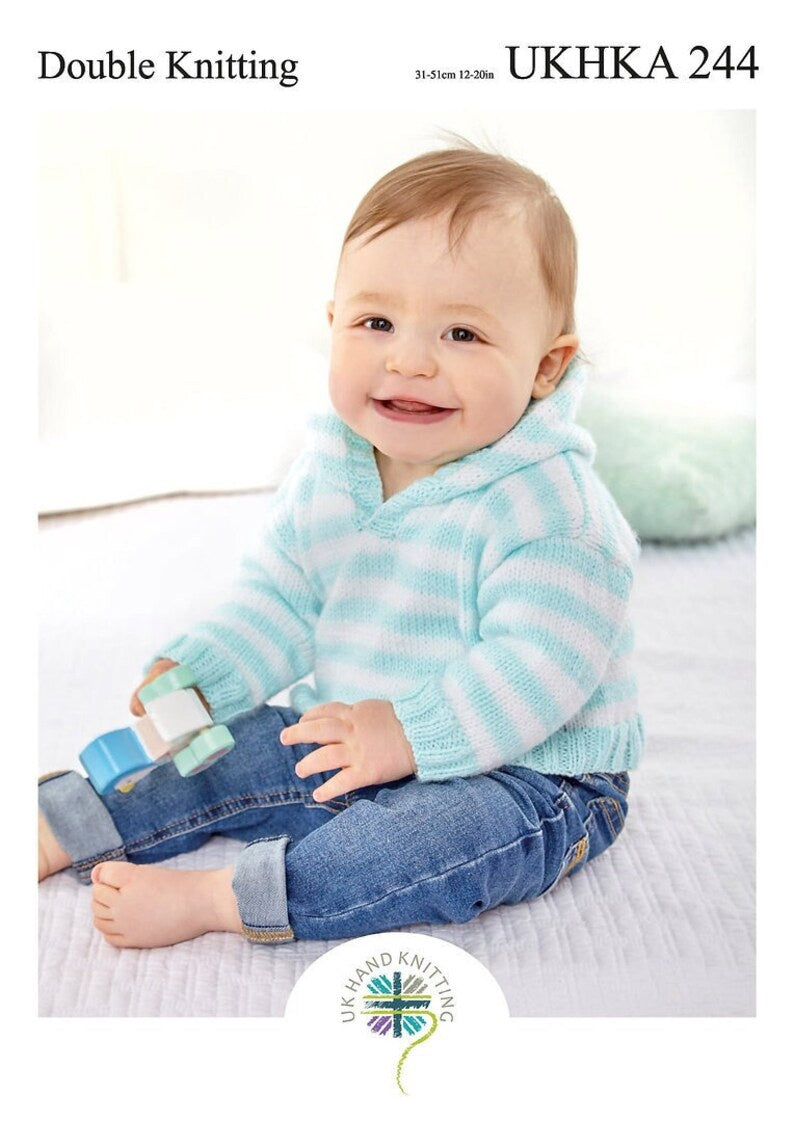 UKHKA Double Knitting Pattern 244 for Hoodies and SweaterThis baby DK knitting pattern leaflet UKHKA 244 will instruct you on how to create a striped hoodie, a plain hoodie and a sweater.