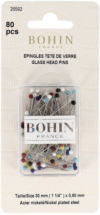 Glass head pins are a favourite amongst sewers and dressmakers. The main reason for this would be the glass head, this will not melt when you run your iron over a sewing piece. Bohin have Fine pins and extra Fine pins so as not to leave a big hole in your work. They also Extra Long and Super Fine pins for Applique.